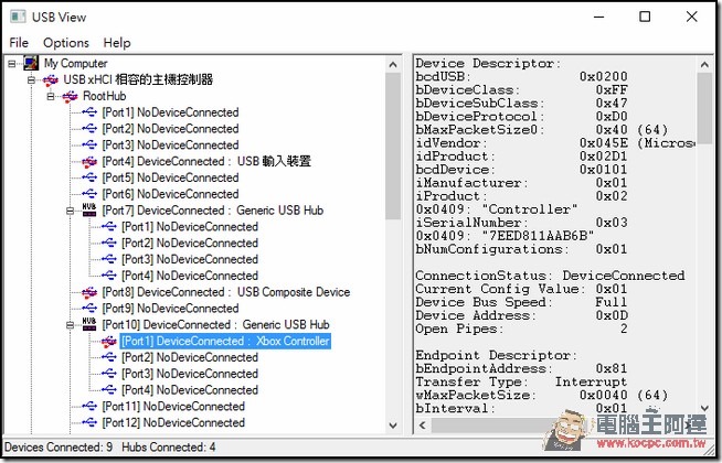 確認USB Hub的位置後,接下來就是要確認Hub上每一個插槽的Port數是多少,就直接拿CronusMax Plus插在USB Hub上吧,看看你把CronusMax Plus插上Hub後,在USB View的介面裡面,Port 10底下的4個插槽,是哪個插槽從原本的「No Device Connected」跑出硬體資訊,像下圖插入後是Port 1出現硬體資訊,就代表CronusMax Plus目前插在USB Hub的Port 1位置上: