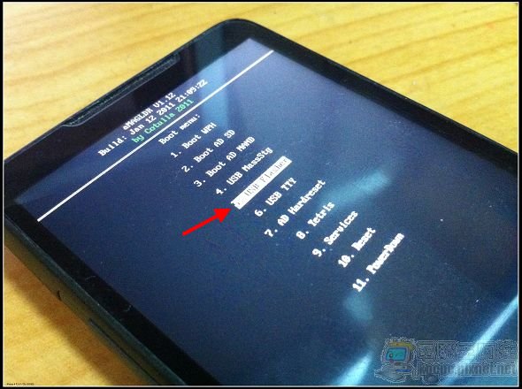 1.刷完MAGLDR之後手機會重開,您的手機畫面會變成下圖,請直接以音量鍵上下移動至「5.USB Flasher」,按下通話鍵進入: