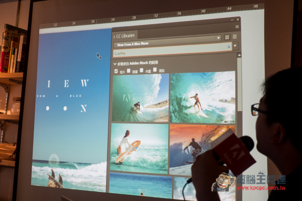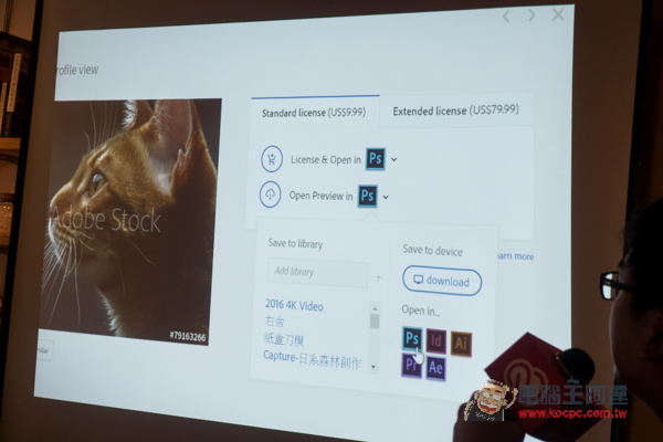 Stock 這次與 CC 更深度整合,提供全新「一鍵化」工作流程,使用者除了能在網站上一鍵將圖像或影像加入創意畫布中,現在在 Photoshop 中使用 Stock 素材時,素材右上角就會出現購買版權的符號,不像以往這麼複雜。