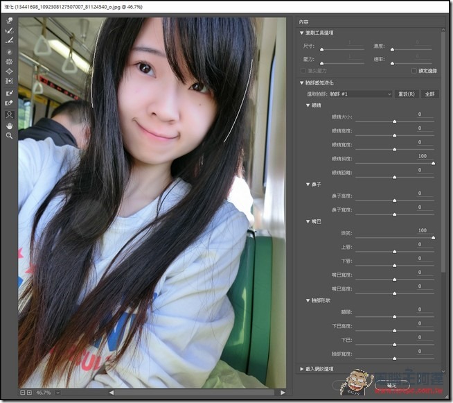 ↑只要你的PS有更新到最新版本,就會在畫面右邊的視窗中看到「臉部感知液化」的區塊