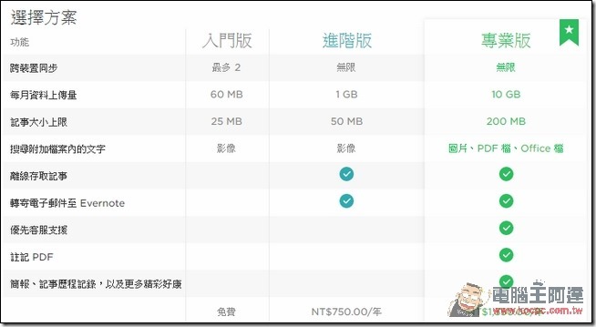 其實仔細看說明後,可以知道,這項限制是在於「程式」方面的限制,像是PC、Android、iOS上的程式,如果你平常使用很多行動裝置、裝置上面都有安裝Evernote的程式的話,你才會遇到這樣的狀況。但是如果你是像小編一樣,在平板與電腦上是習慣使用「網頁版」的話,就不在這個限制內。(簡單來說,如果你是在手機、平板上安裝Evernote的APP使用,電腦上使用Evernote網頁版的話,就剛好符合規定)