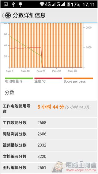 PCMARK 續航力測試,由100%到20%持續以瀏覽網頁、修圖、播放影片與文書處理情境循環測試,約可使用 5 小時 44 分,預估最大續航可到六小時半左右: