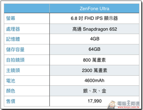 ZenFone Ultra 則是一款 6.8 吋螢幕的巨無霸手機,慶幸的是它還能被一手掌握。這款大尺寸手機以熱愛視聽影音的娛樂族群為主要面向,所以針對視覺效果、顏色調校及音響表現等方面導入各種技術,藉以達到更加優化的視聽影音效果,這款手機搭配了大容量 4600mAh 電池與快充技術,讓追劇一族使用更有餘裕。