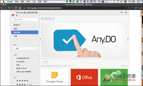 Chrome 瀏覽器讓人很喜愛的一個原因,就是它有非常多實用擴充工具,而好消息是 Vivaldi 也無痛支援,進到工具選單中的延伸套件後,你就會覺得怎麼跟 Chrome 這麼像,網頁移到下方也能找到 ”取得更多“ 的選項