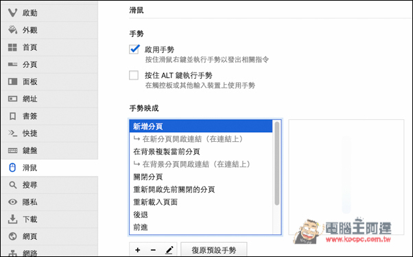 手勢操作簡單來說就是按滑鼠左鍵或右鍵畫出某個圖案,即可啟動上一頁、下一頁、重新整理、關閉分頁等等的功能,不知道怎麼使用的朋友,可至偏好設定的「滑鼠」頁面查看。