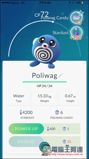 升級神奇寶貝需要兩樣道具:「STARDUST」跟「CANDY」,STARDUST 是全部一起使用,CANDY 則是每隻神奇寶貝都有專屬,像下圖這隻叫 Polliwog,它的 CANDY 就叫「Polliwog CANDY」。