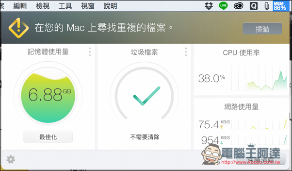 雖然 Mac 不像 Windows 那麼容易中毒、以及有用越久速度越慢的問題,但只要程式一開多,記憶體不太夠時,跑起來還是比較慢,加上時間久硬碟裡也一定會有不少暫存垃圾,因此還是需要一些優化軟體輔助。