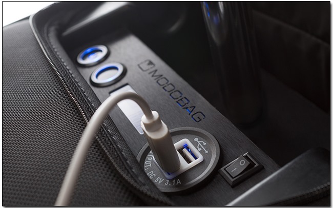 Modobag 上還配有兩個 USB 接口,當你在候機時也能作為一個巨大的行動電源,為你的行動裝置像是手機、平板隨時進行充電;此外你可以利用專屬應用軟體追蹤行李箱的位置。