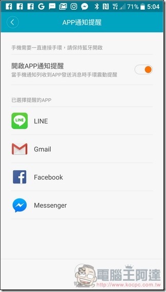 小米手環也可以設定 App 通知提示,開啟「App通知提醒」服務後選擇「管理應用」並勾選希望提示的 App 即可: