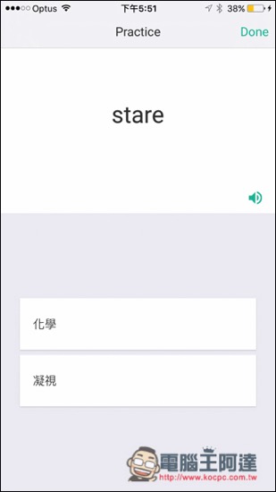 進入後都會出現類似下圖的學習內容,有時候是新單字,有時候則是測驗,答對才能開啟 App。