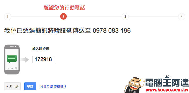 4. 手機會收到 Google 傳來的驗證碼,那六個數字就是驗證碼。