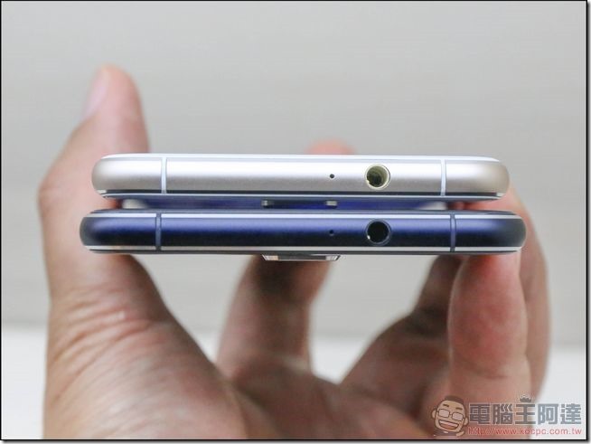 ASUS ZenFone3 採用鋁合金金屬中框打造,邊緣處做了圓形導角設計增加握持穩定度,在金屬中框的上下兩側加入了鑽石切邊處理,營造出雙色設計感。而在機身上緣配置了 3.5mm 支援 Hi-Res 高音質輸出的耳機埠與抑噪麥克風: