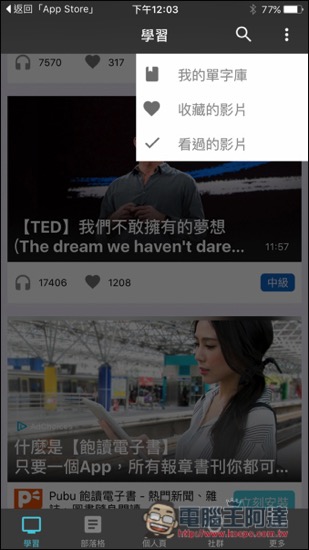 影片預設為全部頻道,有 TED、BBC、CNN、商用英文、以及中英文雙字幕影片等等,如果你希望只觀看某頻道的影片,也可以從上方選單來過濾