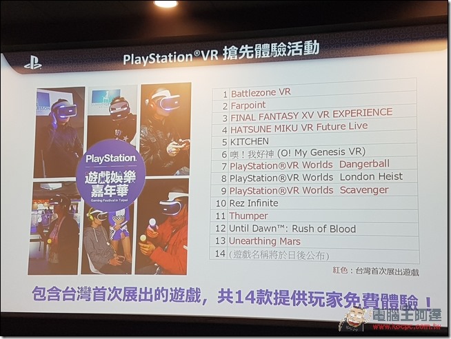 小編這邊也是建議各位這三天有空的話,可以去參觀一下PlayStation遊戲娛樂嘉年華,官方在現場會擺出20台PS VR的體驗機,並且展出14款支援PS VR的遊戲,其中以Final Fantasy XV為首的8款遊戲甚至是在台灣首度展出。