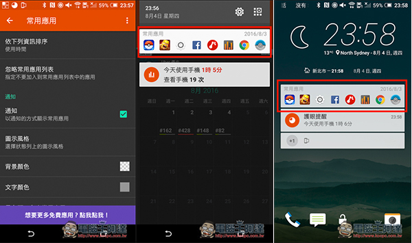 常用應用有兩種使用方式,第一是讓我們在待機畫面與通知列中,即可查看今日最常使用的 Apps 排名,不需特別打開 App Usage,如果想要減少某 App 的使用時間(如:遊戲),就要盡量讓它的排名越後面越好。第二則是只要點選小圖示,就能快速開啟該 App,提升使用手機的效率。