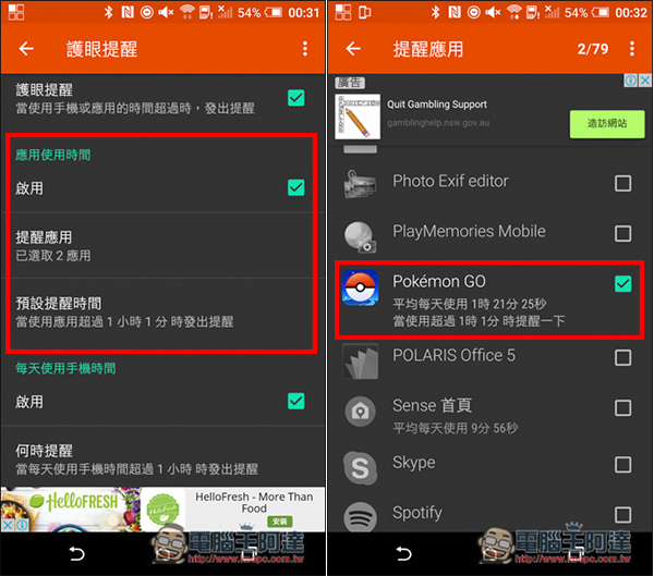 「應用使用時間」:指定的 Apps 如超過使用時間,就會發出通知。像我就設定 Pokemon GO 與部落衝突,如果玩超過 1 個小時就提醒一下,讓我好好控制每天玩的時間。而父母們也能把小孩常玩的 Apps 設定好,時間一到適時提醒,讓他們不會玩到忘我。