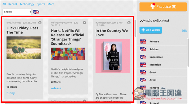 決定好單字後,系統就會開始自動掃描所有新聞來源,並於左側顯示最佳內容。