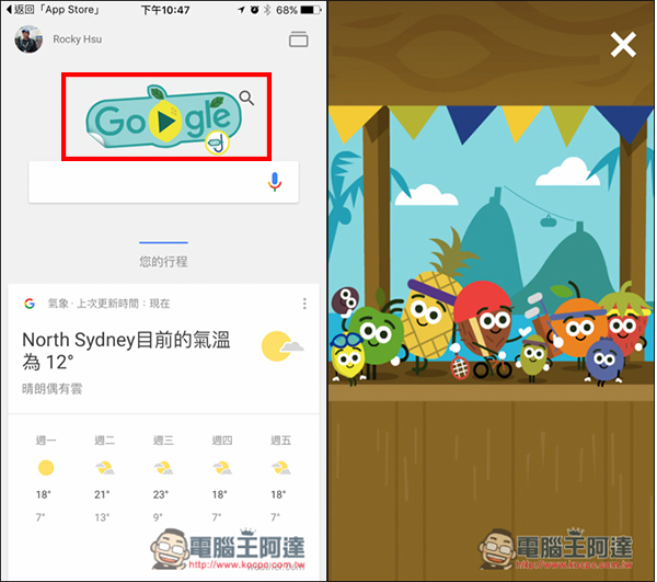 開啟 Google App 後,同樣點選上方的 Google Doodle 就會自動執行遊戲