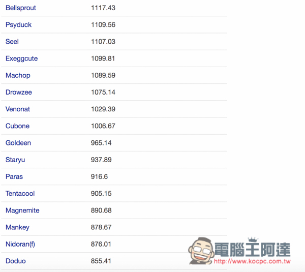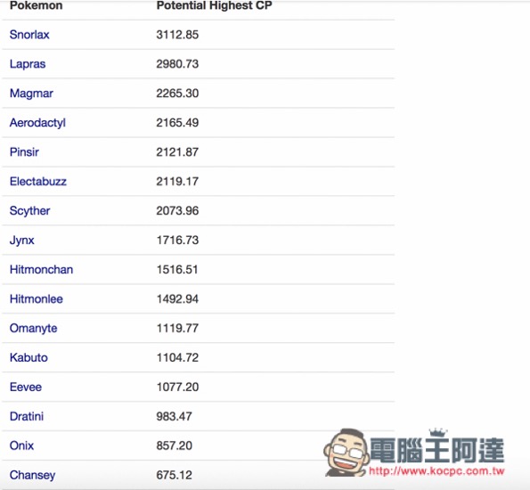 而用孵化的每隻神奇寶貝最高的 CP 值可以到多少,下方截圖也列得一清二楚,卡比獸竟然能到 3000 以上,真恐怖!