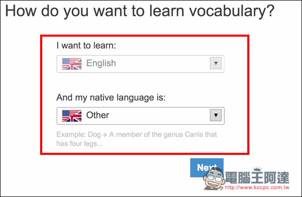 接著會要求我們選擇要學習的語言,Vocabla 提供不少語言,像西班牙、阿拉伯、俄文等等,這篇以英文為範例,上面就選擇 English,下面則是我們的母語