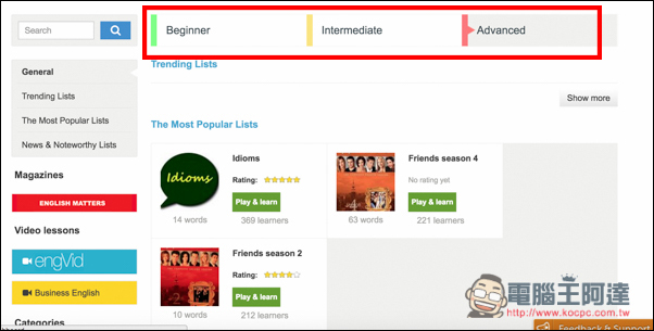而 Library 選單往下滑,也能適合你的等級來選擇單字本,提供初學者 Beginner、中階者 Intermediate 與 進階者 Advanced 三種