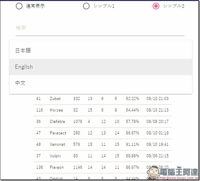 而網站還「英文」、「日文」與「繁體中文」的精靈名稱,看到熟悉的名稱真的是令人懷念阿,甚至在其他模式下,也能使用中文搜尋你的精靈。目前《PokeIV》網站本身有點不穩定,如果遇到網站有問題的話,請稍晚再次使用。