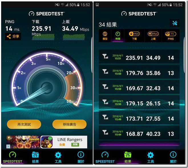 4Gmark:其特色就是除了常見的Ping、下載、上傳速度外,還加入「YouTube Time」與「Web Time」,透過模擬真實的上網行為來驗證網路的品質,但是台灣區要使用的話,必須連線到香港的伺服器來進行測試,實際表現結果很可能會因為連海外的頻寬而遭到限制。