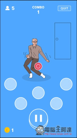 同樣有玩法教學,很簡單,跟一般節奏遊戲玩法一樣,畫面共有五個節奏點,當點進到框框內後按下,就會打在節奏上,Perfect 代表完美、Good 還可以,Bad 則是不再拍子上。另外,畫面中有一扇門,當你看到似乎要打開時,就必須按著下方的暫停鍵(記得是按著),這樣才不會被媽媽發現