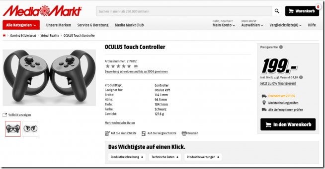 Oculus在今年E3展上,首度將專用控制器Touch亮相後,之後都沒有相關的消息,尤其是許多玩家相當關切的售價與上市日期的部分。不過近日有歐洲的零售商MediaMarkt,不小心將Oculus專用控制器Touch在自家網站上上架,售價為199歐元,折合新台幣約七千元左右。發售日期為2016年11月21日,先不論售價,此上市日期其實與先前Oculus所發布的Q4發貨的消息不謀而合。