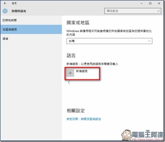 Step01:進入到Windows 10的設定中,選擇時間與語言