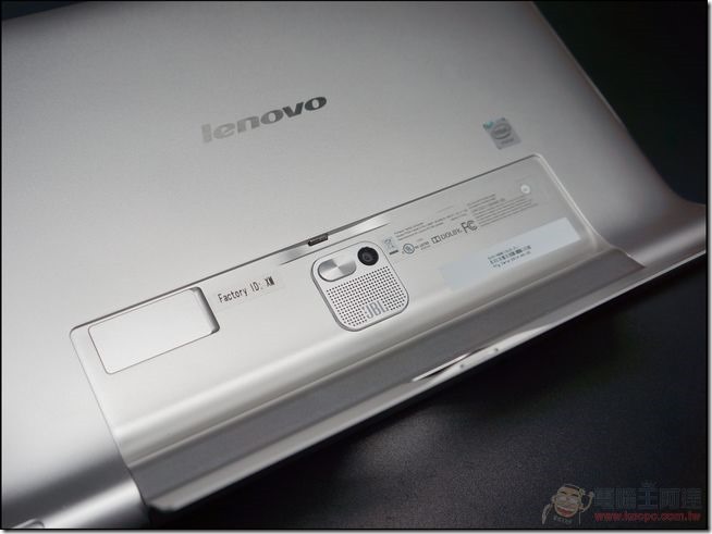 在機身背面的中央位置配置了 800 萬畫素相機、5W 的 JBL 重低音喇叭(與正前方的左右聲道組成 2.1 的立體音效效果)與旋轉立架的管制按鍵:
