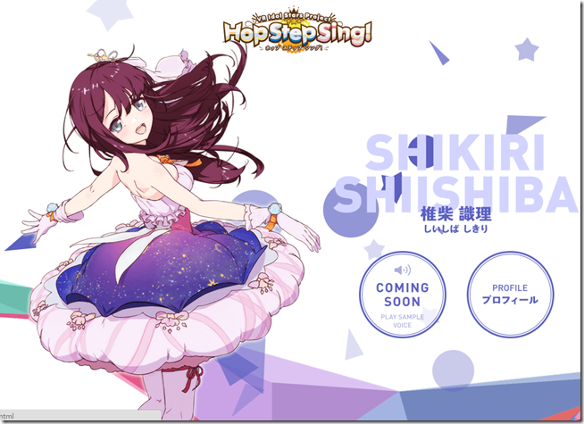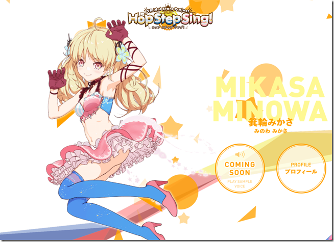而HTC另外一款推出的遊戲是《Hop Step Sing!》,這款遊戲是由CG角色製作公司Polygon Pictures所開發的虛擬偶像計畫。由遊戲《秋葉原之旅》、動畫《TARI TARI》人設Tanu擔任設計,作詞作曲則由Yashikin負責,音樂製作則是鼎鼎大名的《LoveLive!》的Lantis來製作,就是由這三位非常強力的團隊所組成。