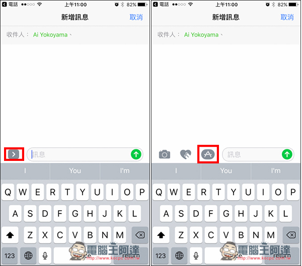 進入 iMessage 功能後,打開左側的「>」功能,並點選「A」選項