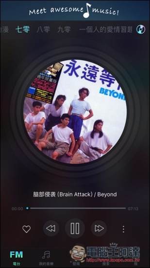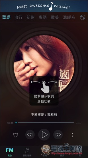 「手機音樂電台 Music FM」支援繁體中文介面,一開啟就是播放介面,上半部為歌單切換,中間則是專輯封面與播放器,下半部還有一些主要功能。