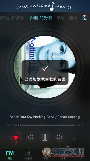而聽到喜歡的歌曲時,也可以按下左下角的愛心,添加到我的最愛裡面