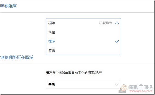 「Wi-Fi設定」中可設定 SSID 名稱、加密方式、密碼與無線通道等內容,如果您想要樓上樓下都能收到訊號的話,可以在訊號強度選項中由「標準」設為「穿牆」,阿達實測小米路由器mini 放一樓,2樓都可以收的到訊號上網: