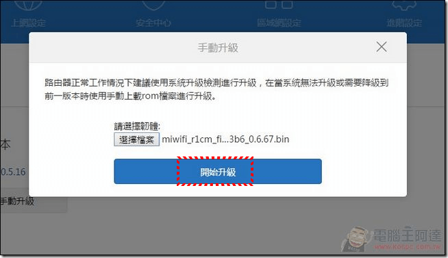 最後執行「開始升級」,在升級等待 5 分鐘左右之後重新連接小米路由器mini,就更新完成了: