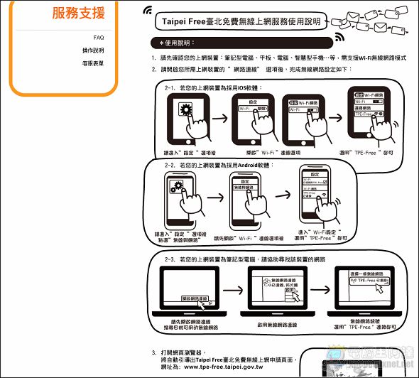 接下來您就可以開始使用免費上網的服務了,臺北市政府很貼心的還有製作如何使用的教學頁面(請點我),簡單說就是找「TPE-Free」的熱點連線就對了: