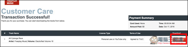 接著就會出現 Download 功能啦!另外有一點要注意是,雖然是免費使用,但有一個條件,Freeplay Music 官方可用各種方式在你的 Youtube 影片前方加入廣告,所以未來突然看到有廣告也不要太驚訝。