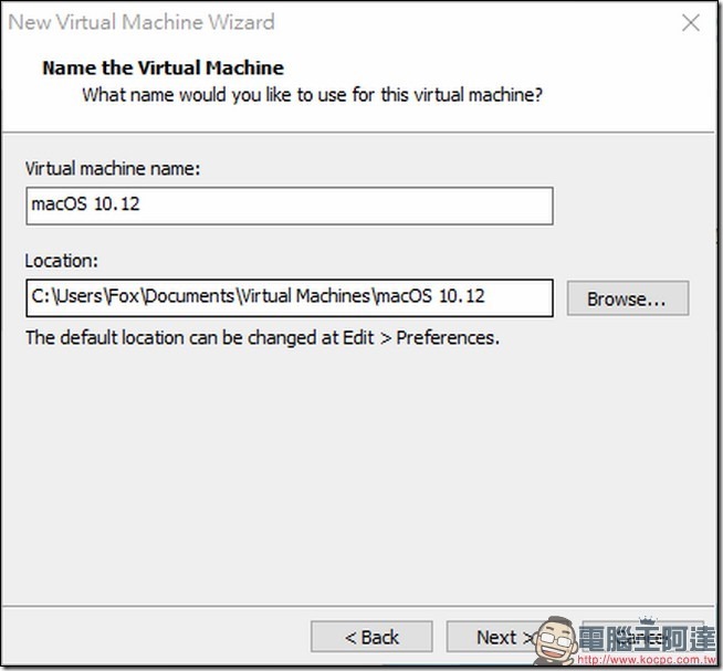 Step 06:這邊是設定名稱與虛擬區域的儲存位置,預設是在文件中,你可以把它改放到其他空間比較大的磁碟區中。選擇完畢後,同樣 Next 前往下一步。