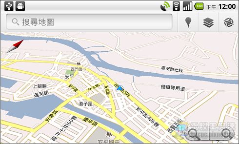 第三個應用則是電子羅盤的應用,執行後Google Maps就會依照您Android機身的方位隨著指南針旋轉(需內建電子羅盤功能的裝置才使用):