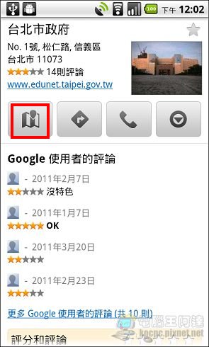 點選地標後就會有景點名稱、地址、網址與網友評論等資料,點選標示就會地圖上直接標示出目標:
