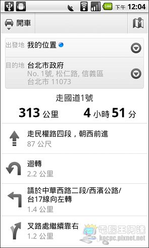 雖然Google Maps地圖在台灣沒有Turn by Turn功能但是配合GPS定位還是可以進行簡單的導航,也可以先預覽導航路線點選「→」可看下一步該怎麼走,如果搭配電子羅盤功能還是可以取代簡單的衛星導航功能: