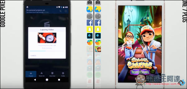 而進到 Lapse 後,縮時攝影的轉檔時間 iPhone 7 Plus 也比 Google Pixel XL 快不少,因此差距又開始拉大