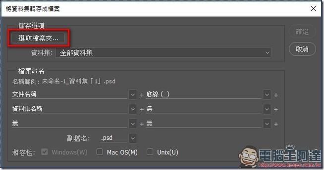 Step 22:接著你會回到 PS 的主要視窗,我們設定好變數後,要開始批次輸出,依序選擇「檔案」、「轉存」、「資料集做為檔案」