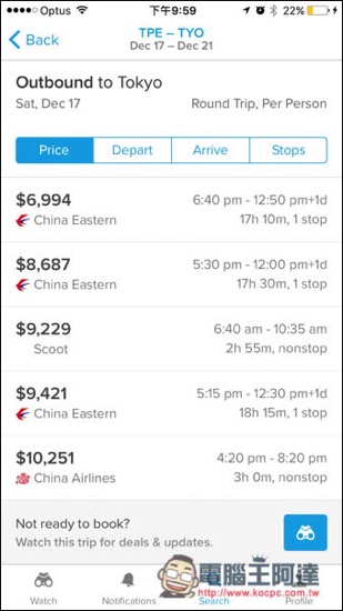 Hopper 提供 iOS 與 Android 版本,在國外非常的有名,只是不支援中文介面,因此知道這款的人很少。介面設計的很清爽簡單,主要功能都在下方,Watch 會顯示你所追蹤的票價、Notifications 則是通知,查詢記錄也會儲存在這、Search 當然就是搜尋機票、Profile 為個人檔案,準備訂機票時會需要申請。