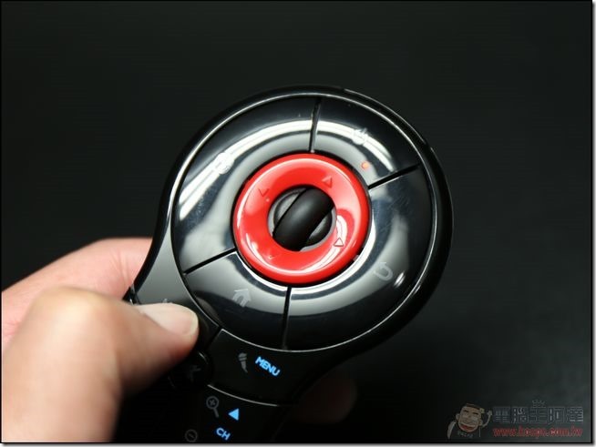 無線遙控鼠每個按鍵都有獨立功能,上方中央的是滑鼠滾輪,可上下滑動頁面,外框的紅色區域則是方向鍵,可快速切換選擇各項功能:
