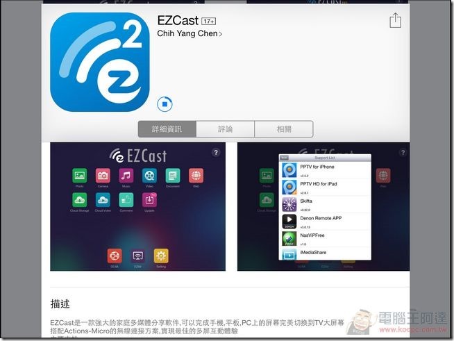 iOS部分由於 Apple 專利問題 BenQ JM-250 無法直接支援 AirPlay 協定,所以只能透過安裝「EZCast」這類應用也一樣可以將影片、照片由 iOS 裝置以無線傳輸的方式投影到 BenQ JM-250 上面:
