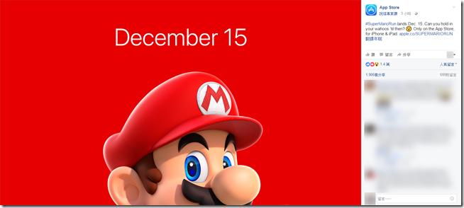 當初《Super Mario Run》最初亮相的地方,就是在蘋果發表會上,當時就引起了不小的旋風。當《Super Mario Run》在官網發布這個消息後,App Store 也在 Facebook 官方粉絲頁上發布這個消息,馬上就引起 1.4 萬個讚、1906 個分享,看起來玩家也是非常的買單,就看任天堂能不能繼《Pokemon Go》後再創熱潮。不過美中不足的是,官方目前還沒有公布 Android 版本的上市時間,快點公布啊!