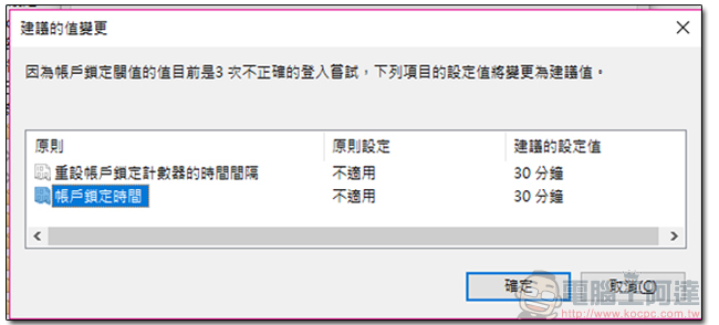 7. 接下來設定「帳戶鎖定時間」,雙擊後你可以看到 Windows 貼心預設 30 分鐘。雖然這裡可以設定最長為 99999 分鐘,但別忘了如果是你忘記密碼,那可就慘了,因此建議可以設定在 10 至 30 分鐘左右。